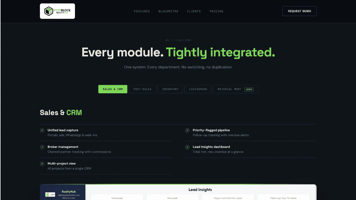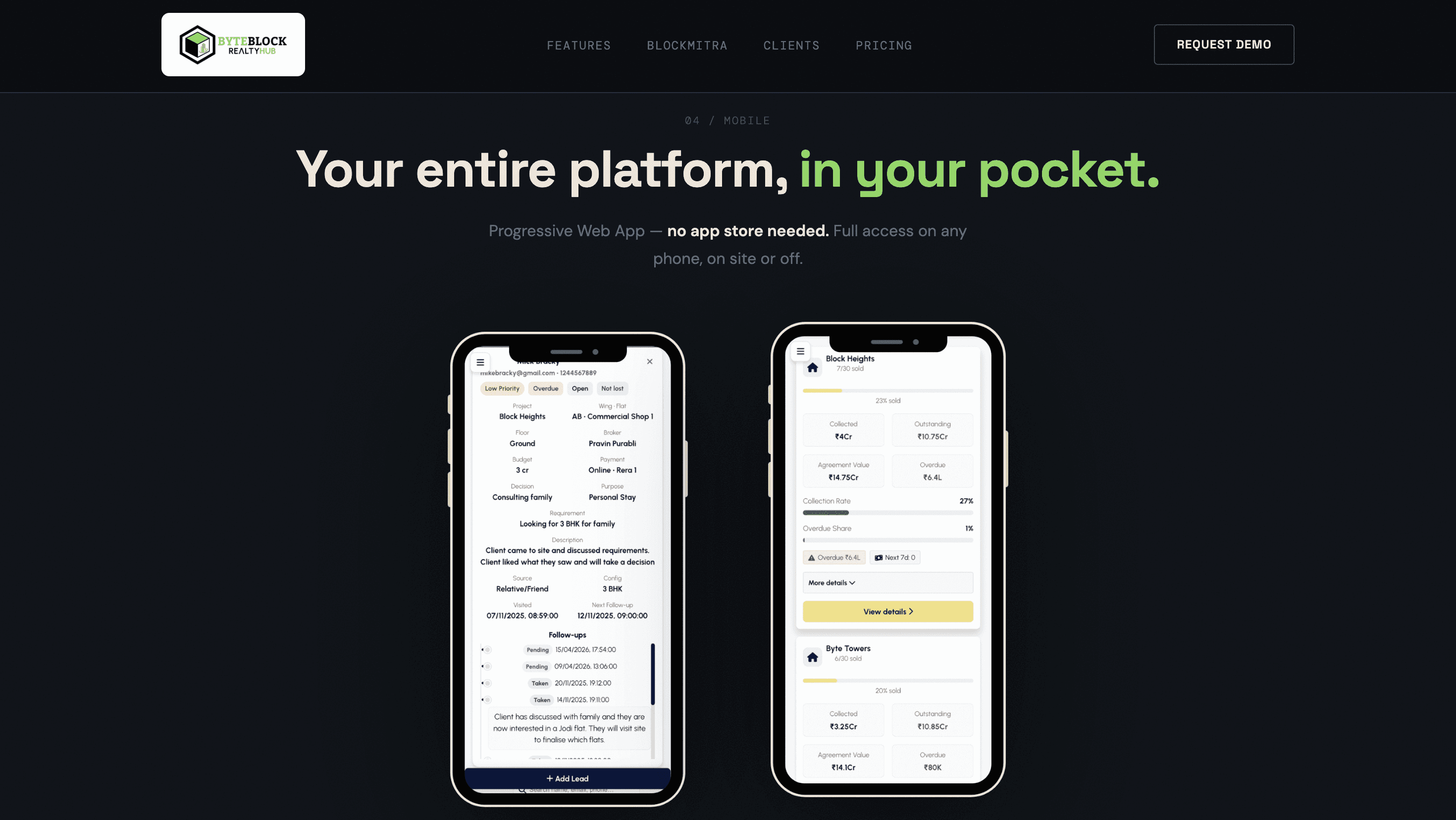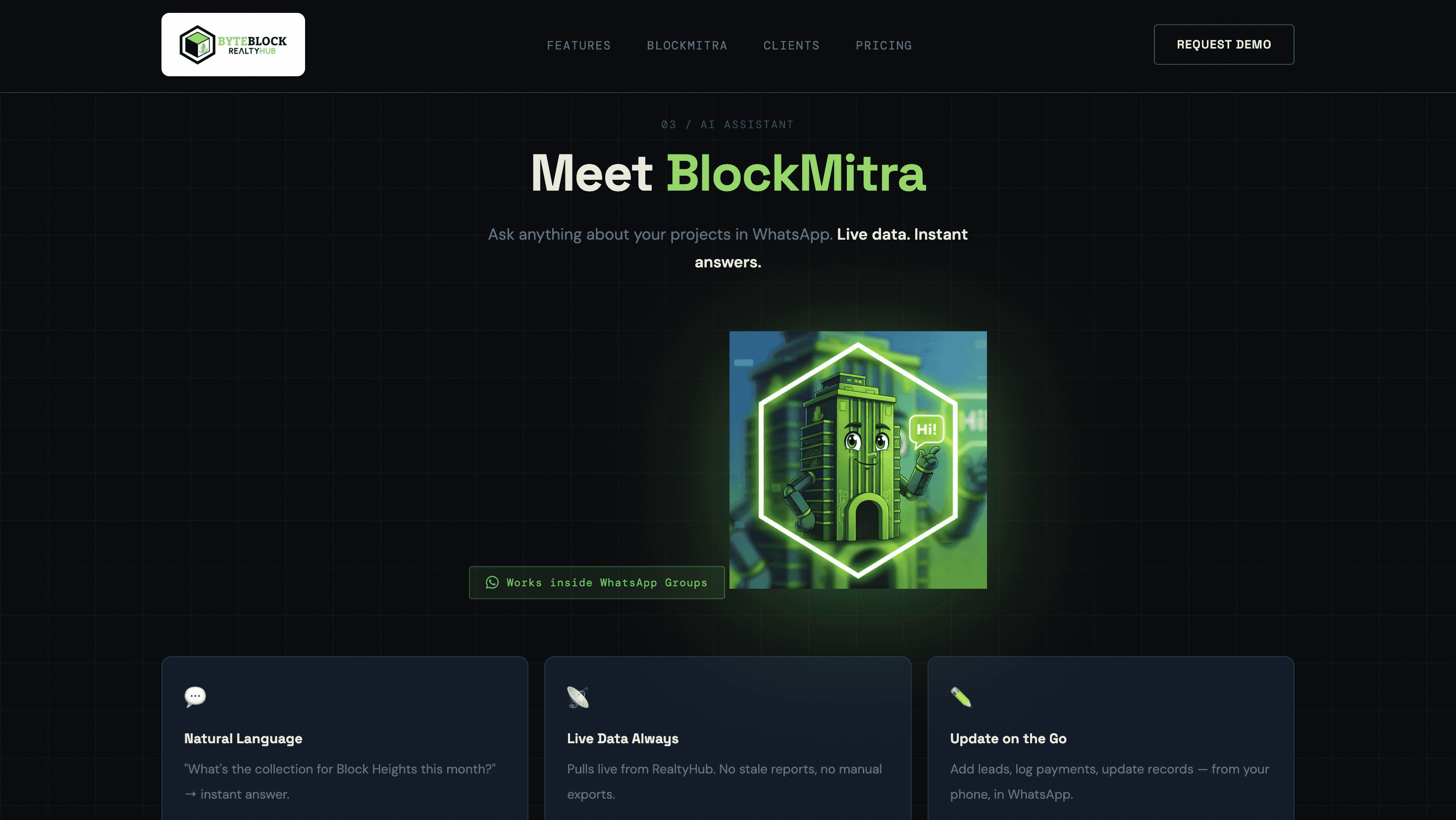 Helped build the marketing site for ByteBlock RealtyHub, a B2B SaaS platform for Maharashtra real estate developers. Handled positioning, page structure, and the full build from hero to pricing.