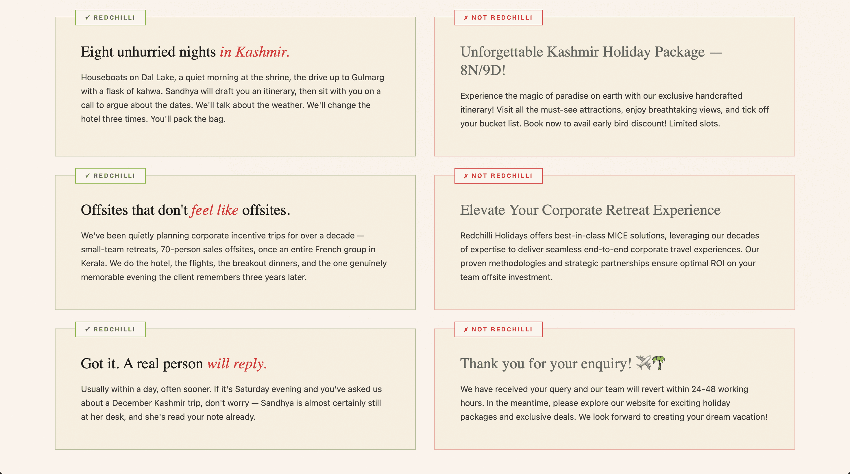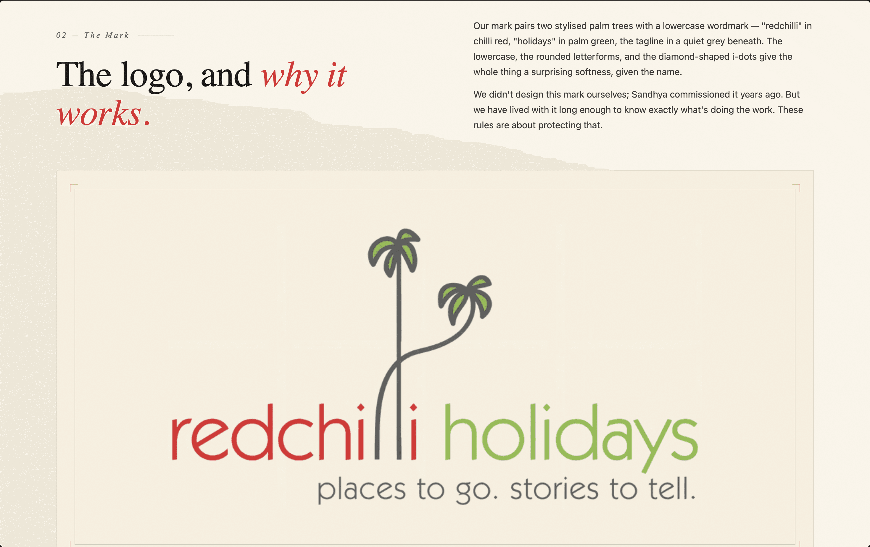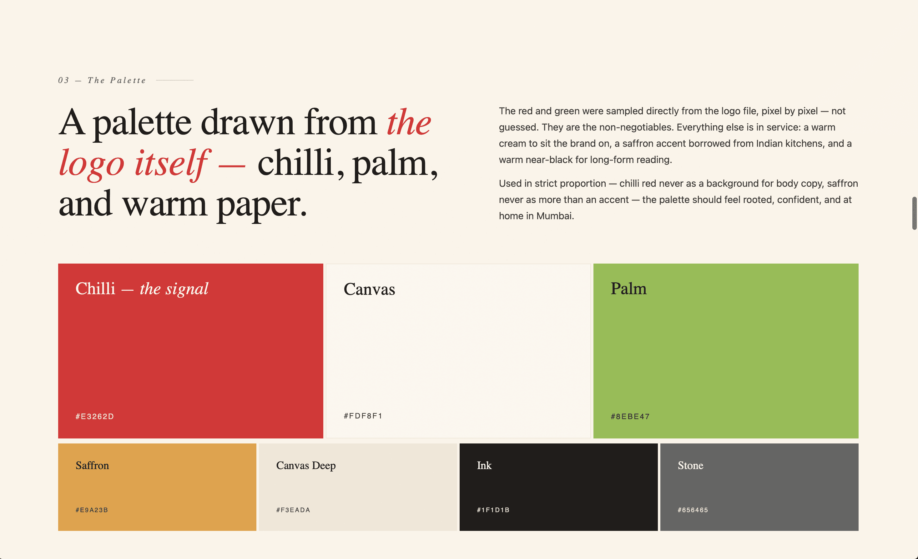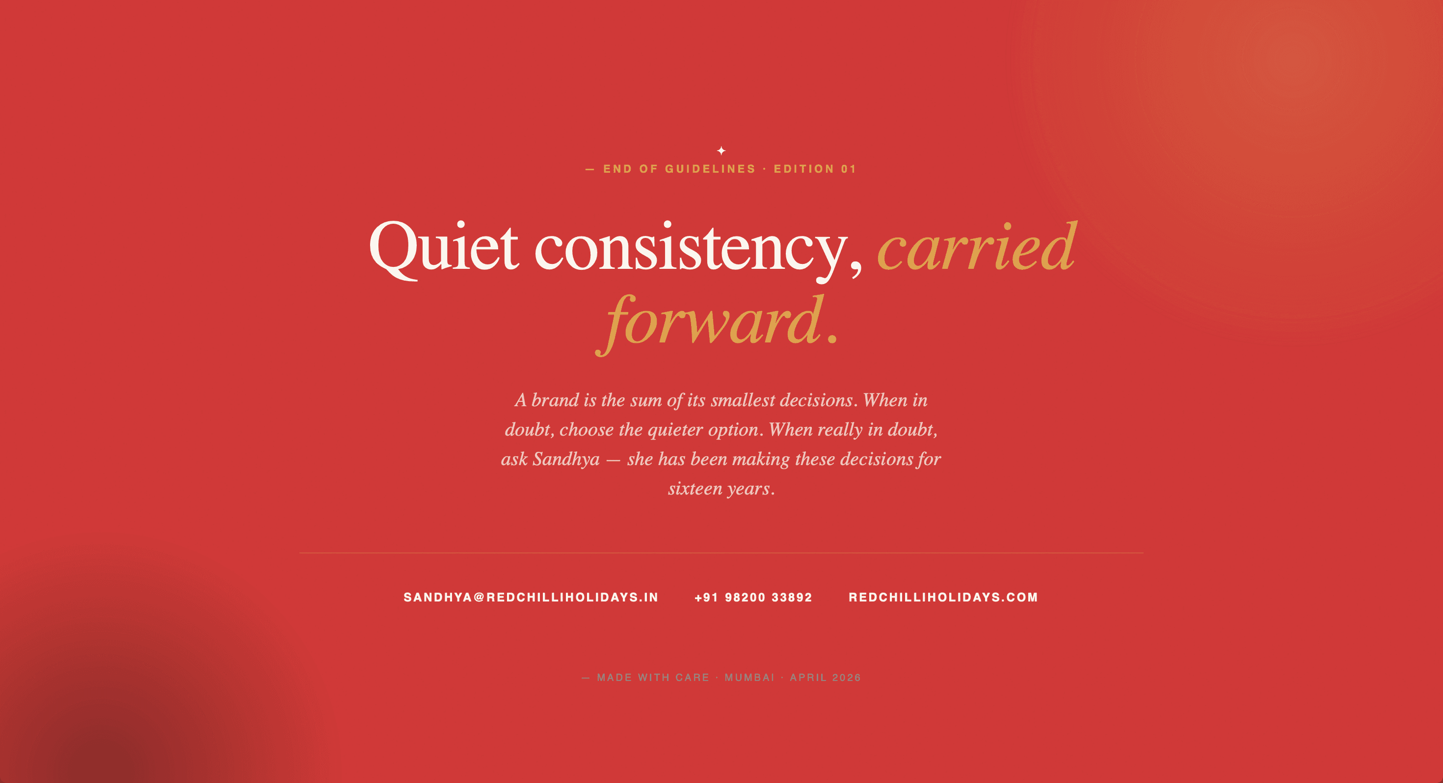 Wrote and designed the complete brand book for Redchilli Holidays, a boutique travel curator in Mumbai. Covered positioning, voice, palette, and logo rules across six chapters, translating 16 years of studio reputation into a system the next generation of the team can carry forward.